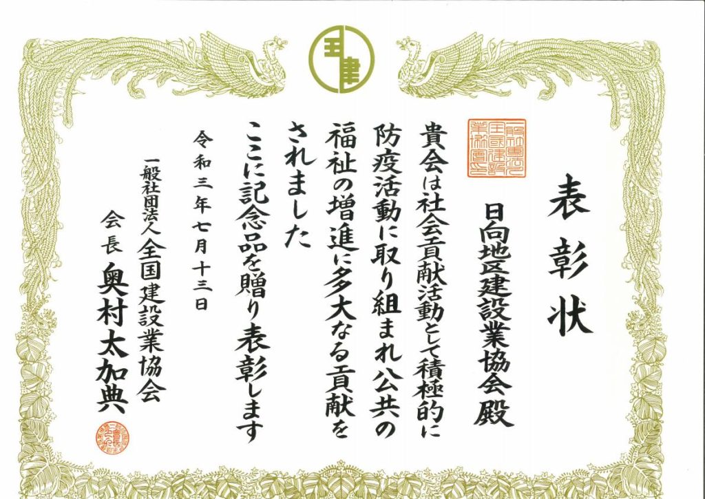 一般社団法人全国建設業協会より「令和3年度社会貢献活動推進月間功労者表彰(規定第3条関係)」を受賞いたしました。