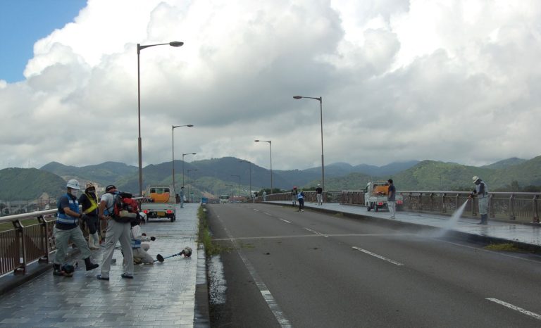 日向地区では日向地区建設業協会青年部20名、日向土木事務所職員3名が参加し、日向市のたいえい橋(全長315.6メートル)のゴミ拾い、草刈り、泥撤去、洗浄、高欄磨き、拭き上げ等の作業を行いました。