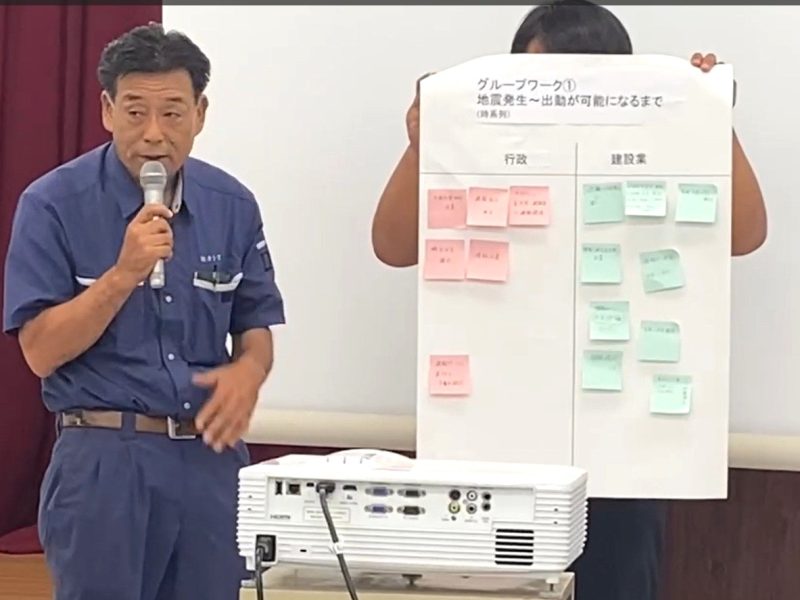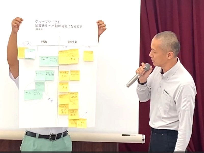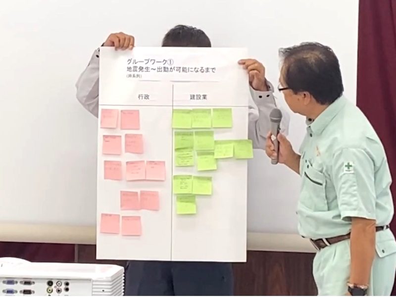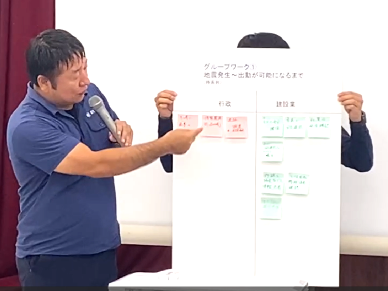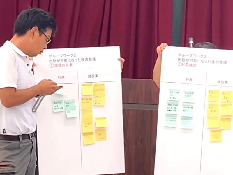 続いて行われたグループディスカッション②では、地震発生後に道路啓開へ出動が可能となった段階での一連の対応手順について意見を出し合いました。建設業界の立場からは、協会との連携、機械・資材や出動可能な人員の確保、避難指示の確認や情報収集、食料や発電機などの物資・燃料の確保、近隣住民の救助、避難場所への物資運搬ルートの確保など、復旧活動の重要性が確認されました。一方、行政側からは、職員間の連絡体制や避難所の運営、応急指示の発出、地域外からの応援確保、地域との情報共有を円滑に行うための備えが必要であることが確認されました。
