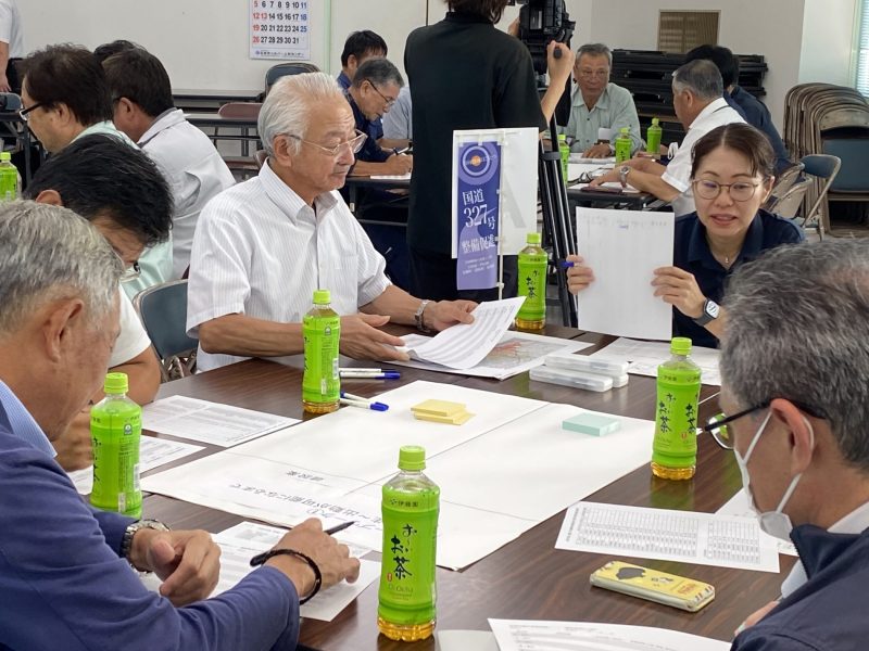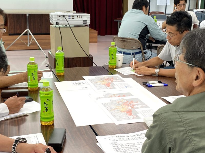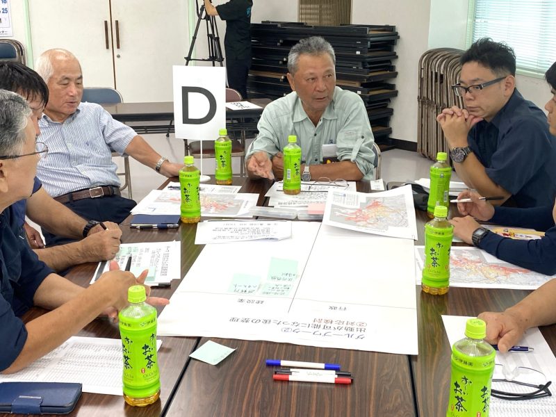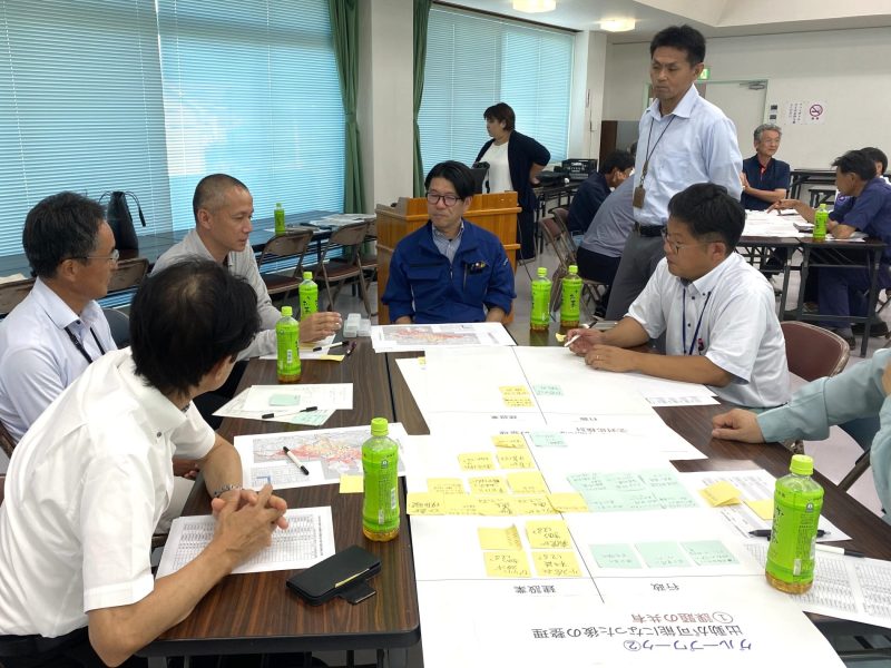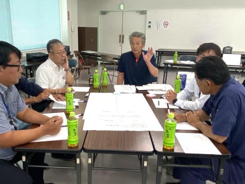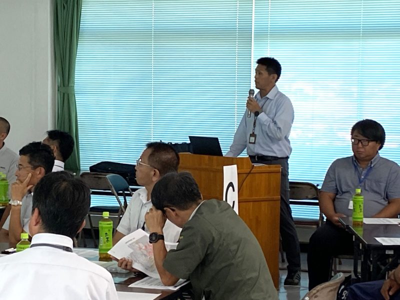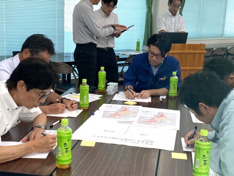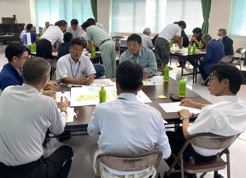 その後、参加者を5班に分け「日向ICからの道路啓開について」をテーマにグループディスカッションを行いました。まず、グループディスカッション①では、南海トラフ地震発生を想定し、県・市町・建設業者などそれぞれの立場から、地震発生直後に何をすべきか、最優先事項について一人一人が考察しました。各班とも進行役を中心に活発な意見交換が行われ、現実的な対応策や今後の課題を整理しました。その後の班ごとの発表では、「災害発生時にまず何をすべきか」の確認をはじめ、浸水時の代替え拠点や連絡手段の確保、必要な人員・資機材・燃料・電源の確保方法などについて具体的な意見が多く挙げられました。
